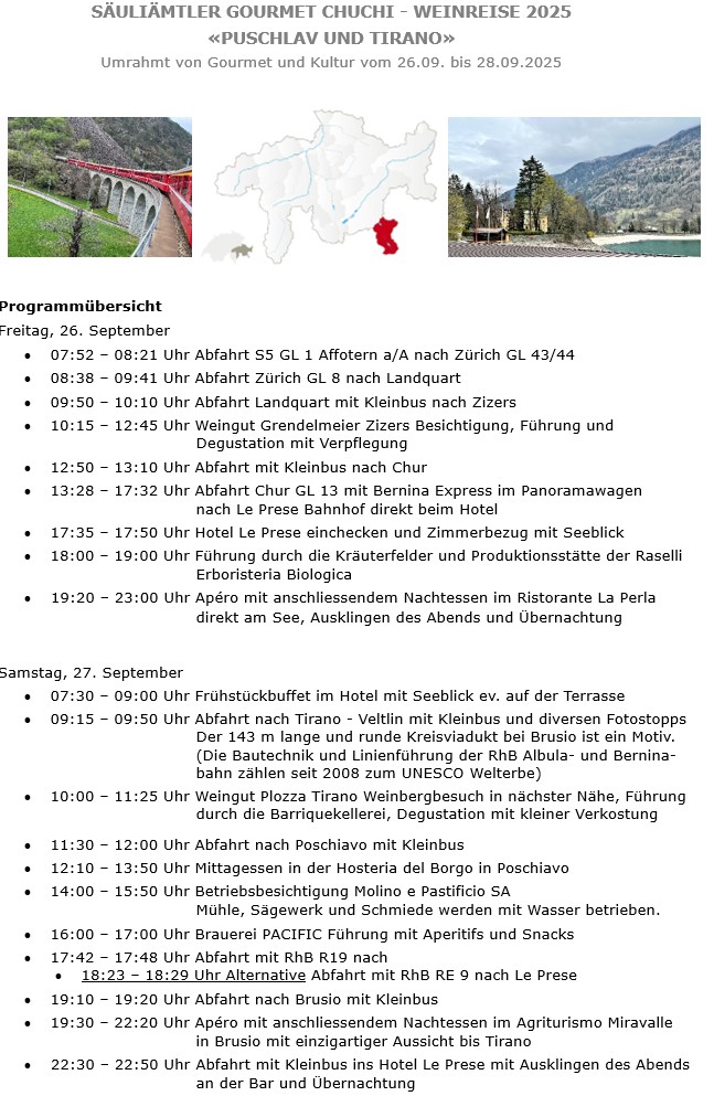 Unsere Reise findet vom 22. – 24. September 2023 ins drei Seenland statt. Bei den drei Seen handelt es sich um den Bieler-, den Neuenburger- und den Murtensee. Die Gegend hat önologisch und kulinarisch viel zu bieten. Bitte meldet euch bis zur nächsten Chochete vom 14. März an oder ab, damit wir rechtzeitig mit der Planung starten können.